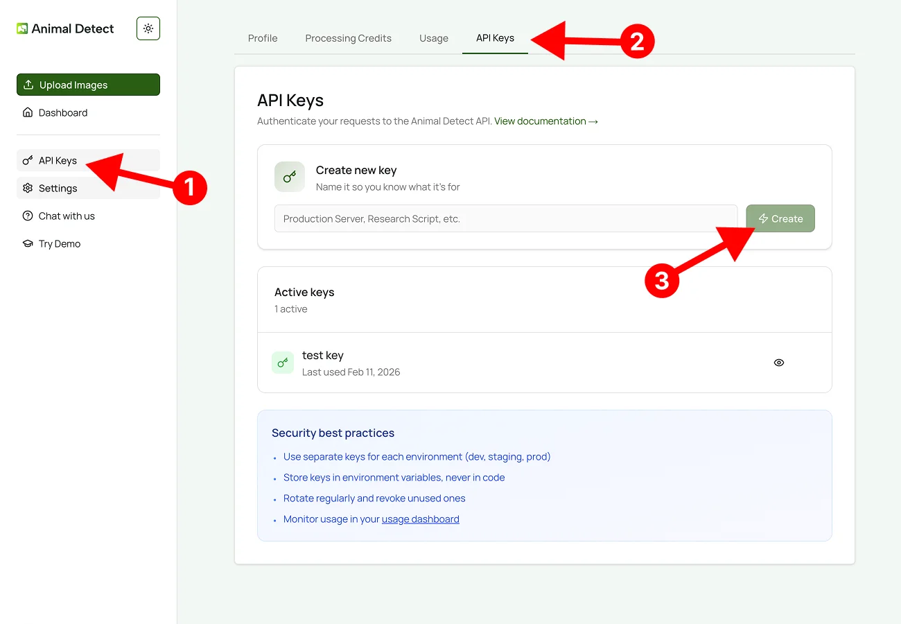Navigate to the API tab in your Animal Detect account settings. Generate a new API key. Copy it and use it in your application. Keep the API keys secure and do not expose them in frontend or open-source projects. We recommend storing API keys in environment variables of your project.